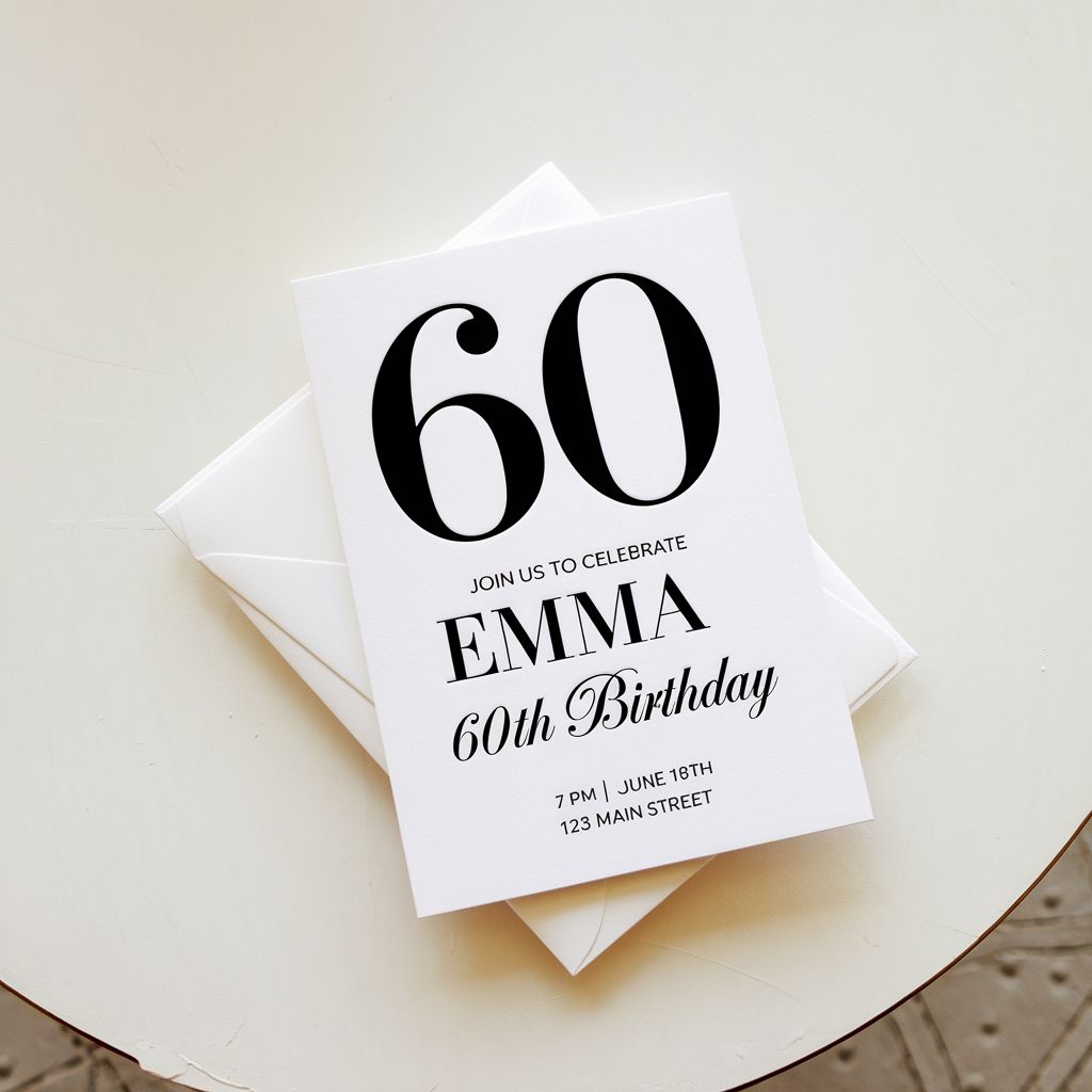 Elegant invitations for 60th birthday parties. Muokattavissa tapahtuman tiedoilla, nimillä ja suunnitelmilla. Ihan täydellinen perheen kokoontumisiin ja juhliin.