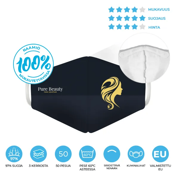 Uudelleenkäytettävä kasvomaski, jossa kaksinkertainen polyesterikerros. Keskisauma lisää maskin käyttömukavuutta. Joustavat nauhat pitävät maskin hyvin paikallaan.